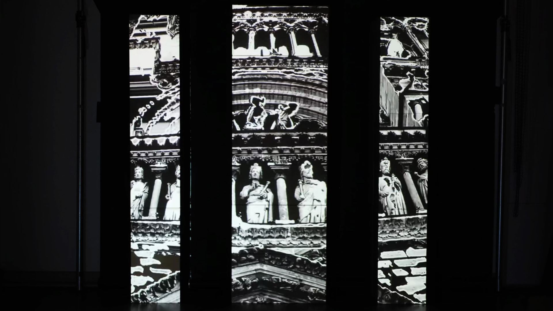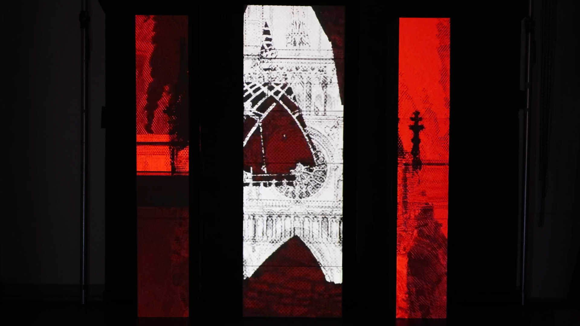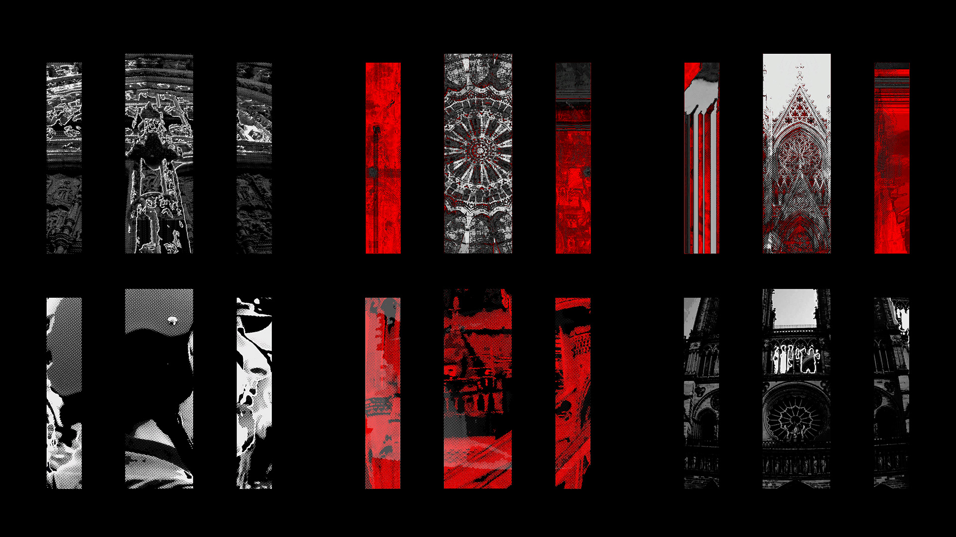 Animation projetée sur trois colonnes en carton, mettant en scène des visuels synchronisés à la musique « The Dreamer In Her » de Thomas Azier. Travail autour d’une narration visuelle, centrée sur le thème des cathédrales, abordant des questions liées au regard, à l’observation et à la fascination pour la destruction. Projet réalisé avec Resolume Arena.