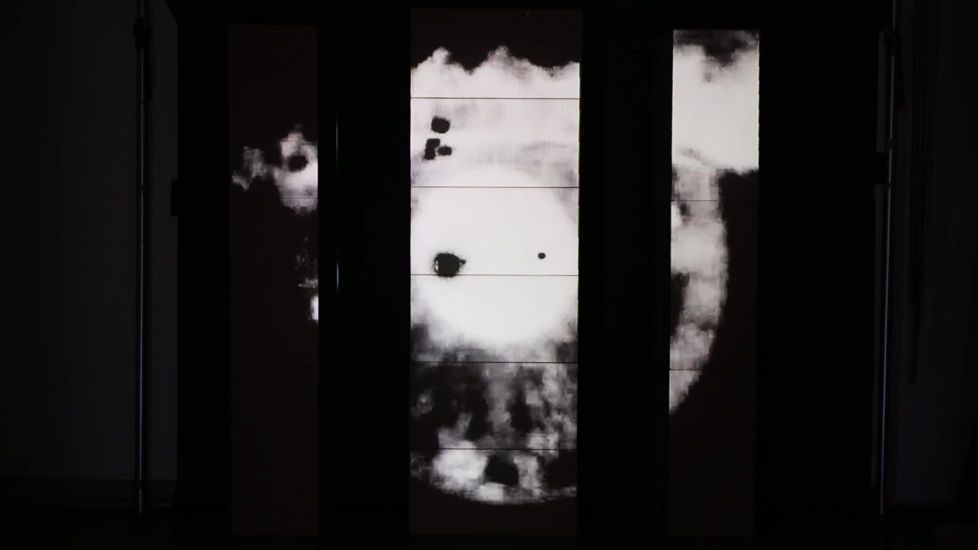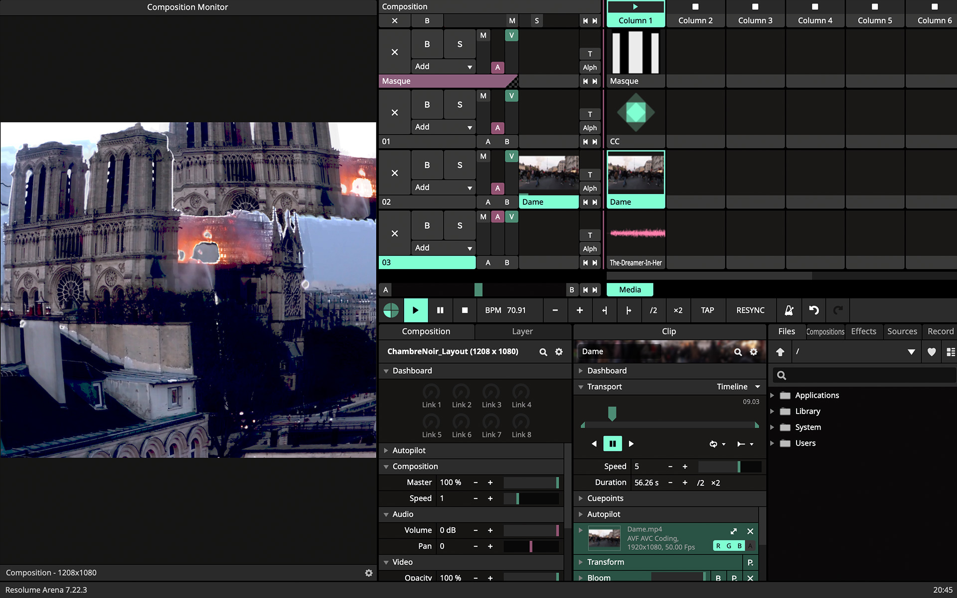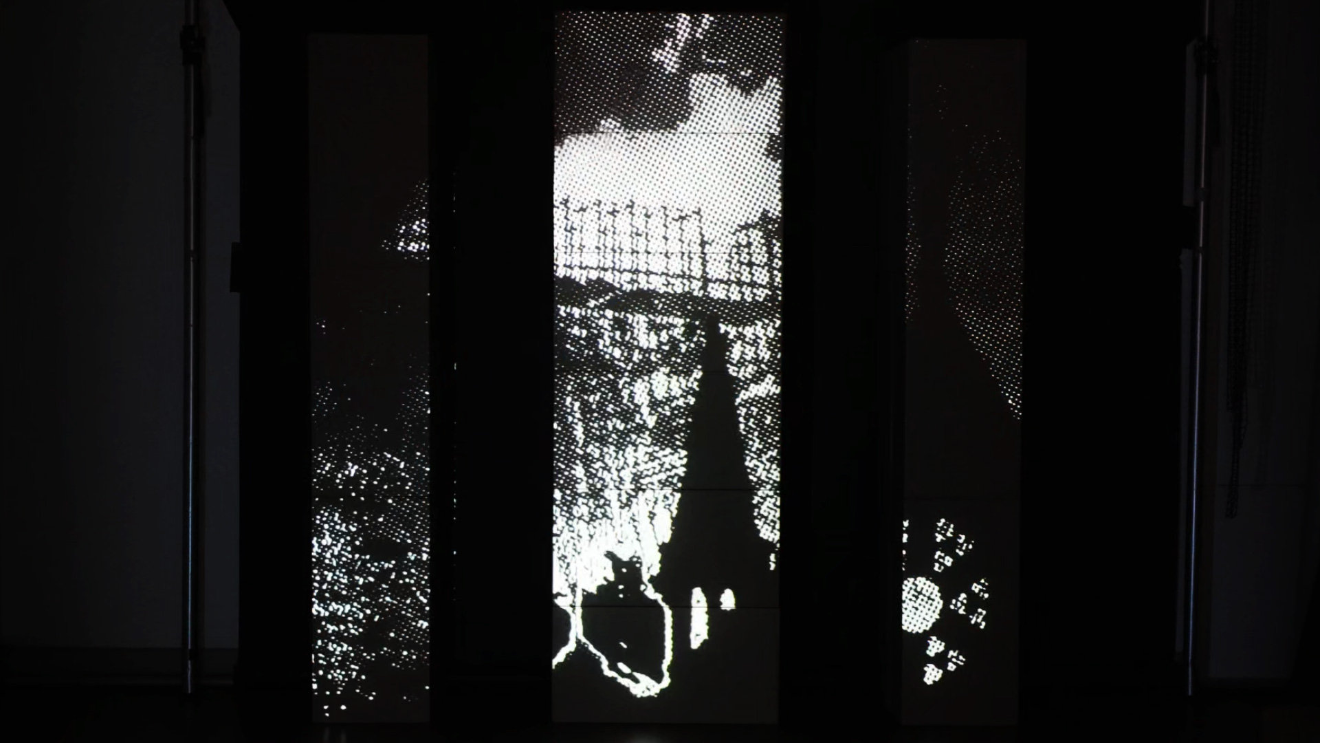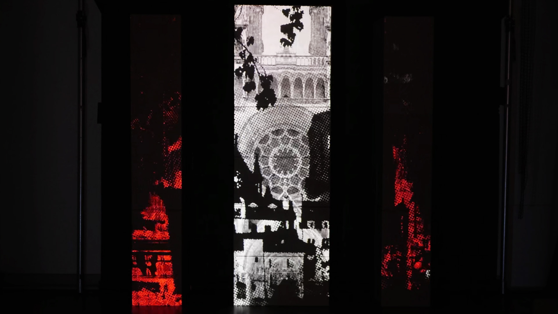 Animation projetée sur trois colonnes en carton, mettant en scène des visuels synchronisés à la musique « The Dreamer In Her » de Thomas Azier. Travail autour d’une narration visuelle, centrée sur le thème des cathédrales, abordant des questions liées au regard, à l’observation et à la fascination pour la destruction. Projet réalisé avec Resolume Arena.