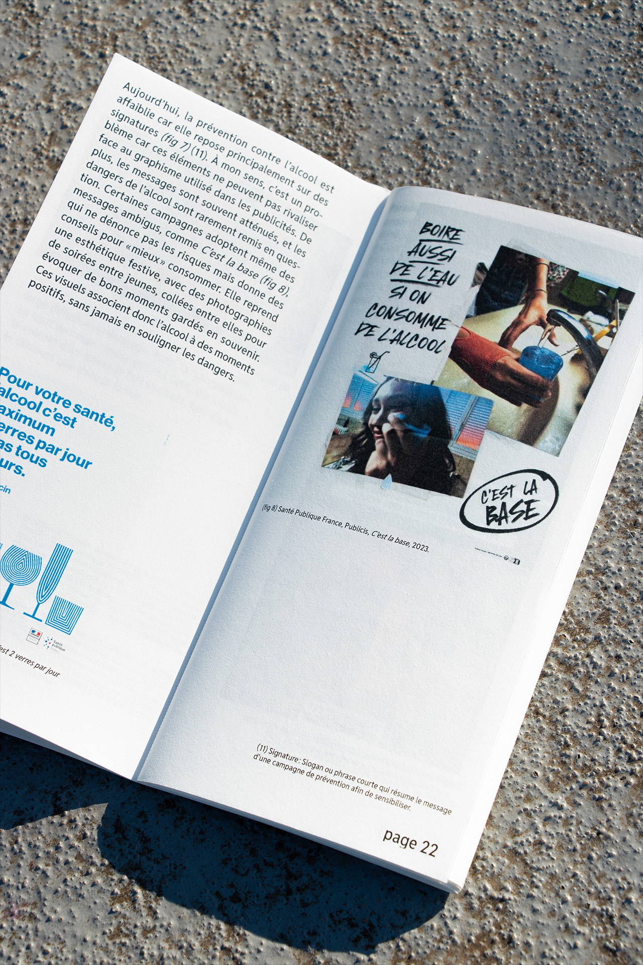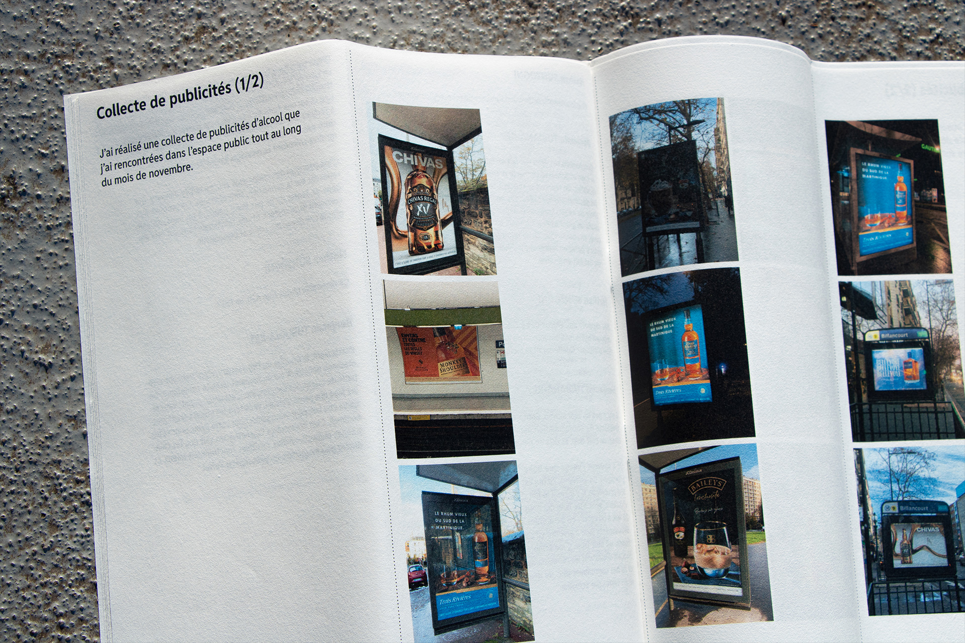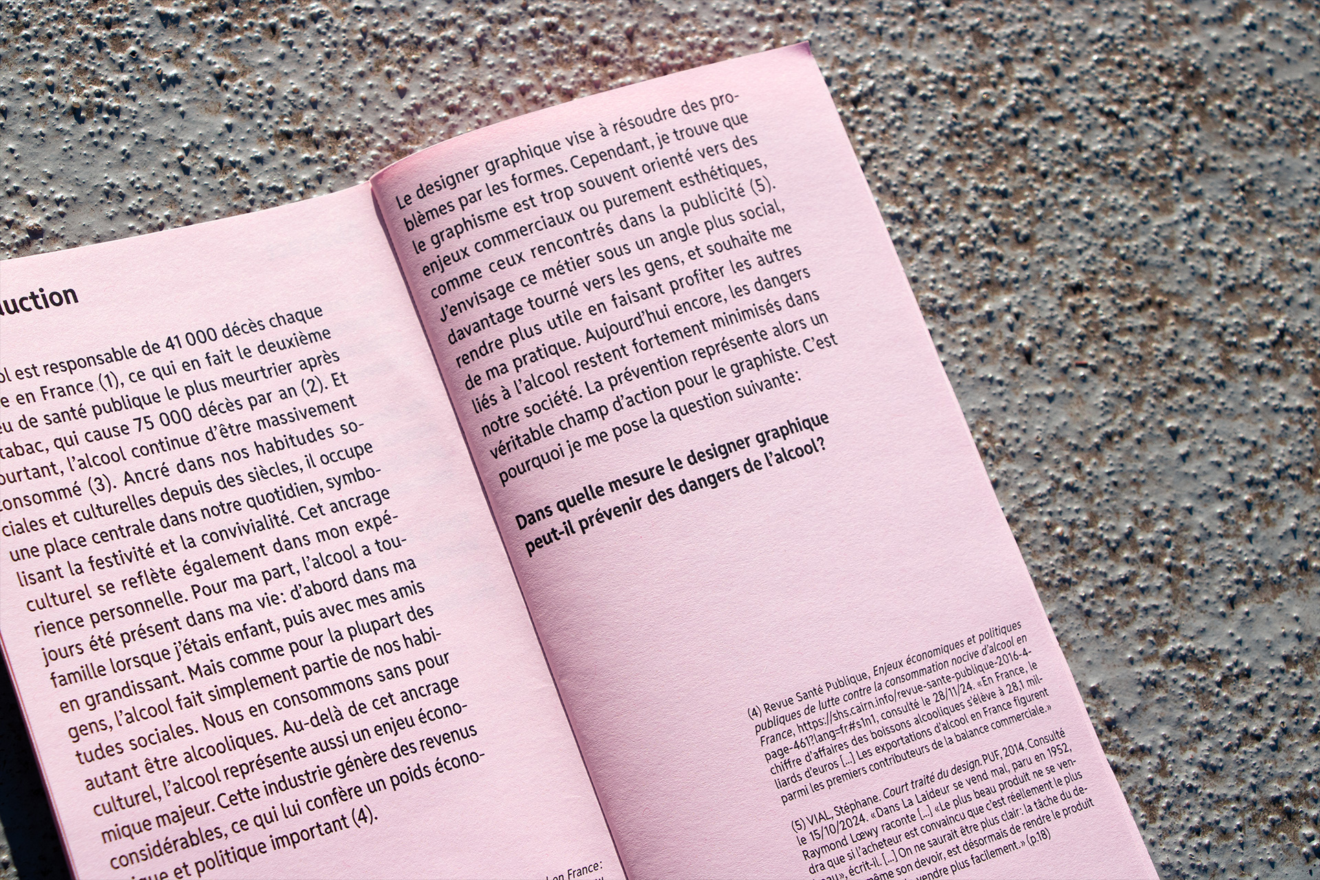 Rédaction d’un mémoire intitulé « Un graphisme contre l’alcool » dans le cadre de mon DNMADE Graphisme Augmenté. Mes recherches ont porté sur la communication visuelle autour de l’alcool et de son ambivalence, partagée entre la publicité et la prévention.